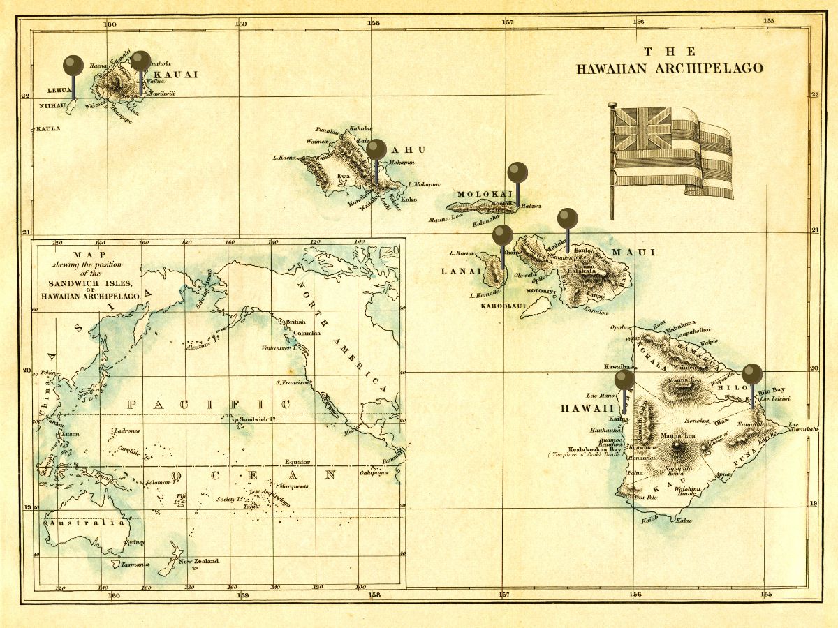 Vintage Map of Hawaii with Pins showing port areas - 2TravelDads